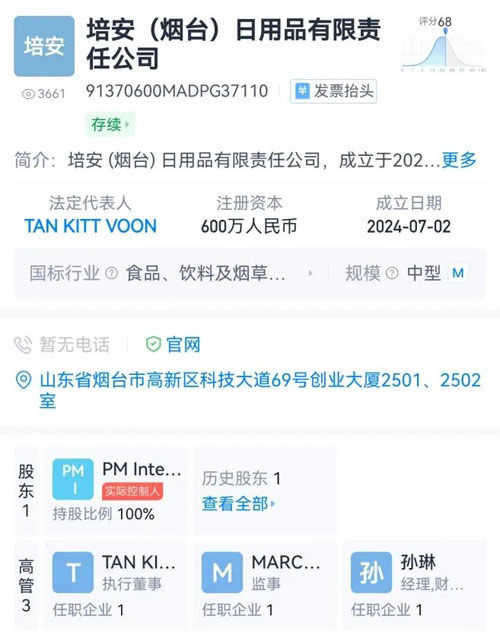 另一个则是2024年7月2日注册成立的培安(烟台)日用品有限责任公司,该公司于2024年8月6日将注册资本由100万提升到600万元,最初的法人、经理、财务负责人均为海外华人Chanjun Sheng,但此人于2025年5月13日辞去法人和执行董事职务,并于5月16日继续让出了总经理和财务负责人身份,现总经理和财务负责人为中国人孙琳,尚不清楚是否为该公司真正业务负责人。
