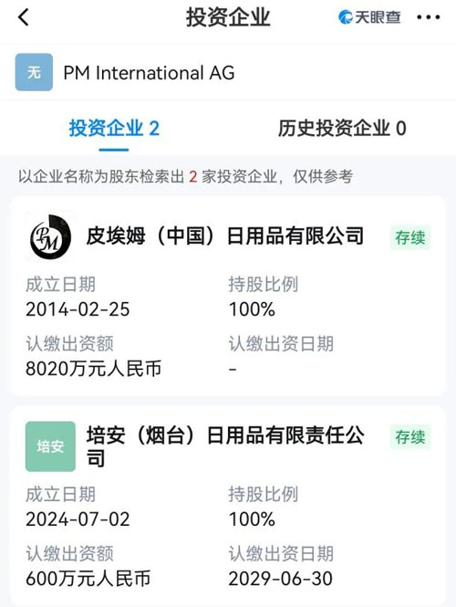 本小点查询到,PM International AG公司仅在中国投资了两家公司,均为100%持股: