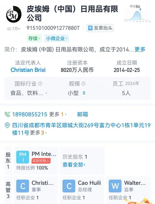 一个是2014年2月25日在成都注册成立的皮埃姆(中国)日用品有限公司,经理人为CAOHUI LI,疑似海外华人。该公司注册资本8020万元人民币,明显是奔着申请直销牌照的标准来的。据说该公司曾于2015年申请直销牌照并在中国启动市场,虽然申牌未能成功,市场却悄然萌芽。