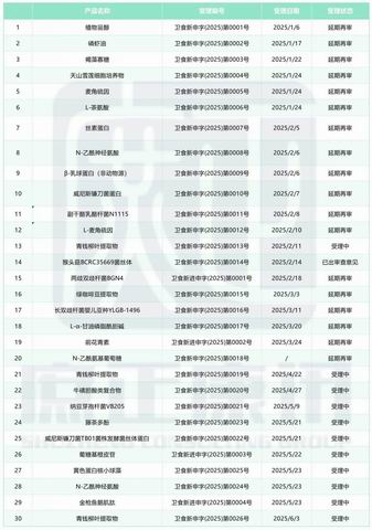 截至2025年6月17日,国家健康卫生委员会(以下简称“卫健委”)共发布2批次7种新食品原料,8种公开征求意见,另外有3种原料被终止审查。