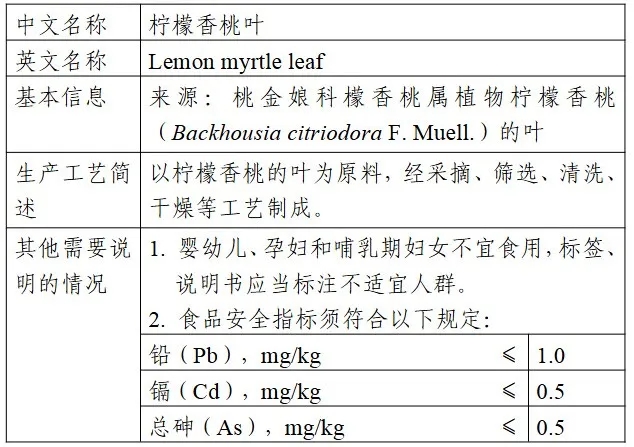 本产品为鼠李科枣属植物枣(ZiziphusjujubaMill.)的叶,主要成分为碳水化合物、蛋白质、脂肪,且含有总黄酮(≥1.0%)等,在我国多省具有长期人群食用历史。本产品终止审查,可作为食品原料使用,使用方式为泡饮或作为原料用于饮料。食品安全指标须符合以下规定:铅(Pb)≤5.0mg/kg。