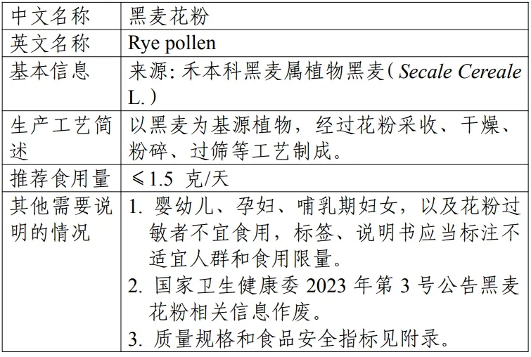 卫健委在2023年第3号公告已经批准黑麦花粉为新食品原料。基于行业发展需求和新数据论证,现将原公告中膳食纤维的含量要求修订为≥30g/100g并重新公告。