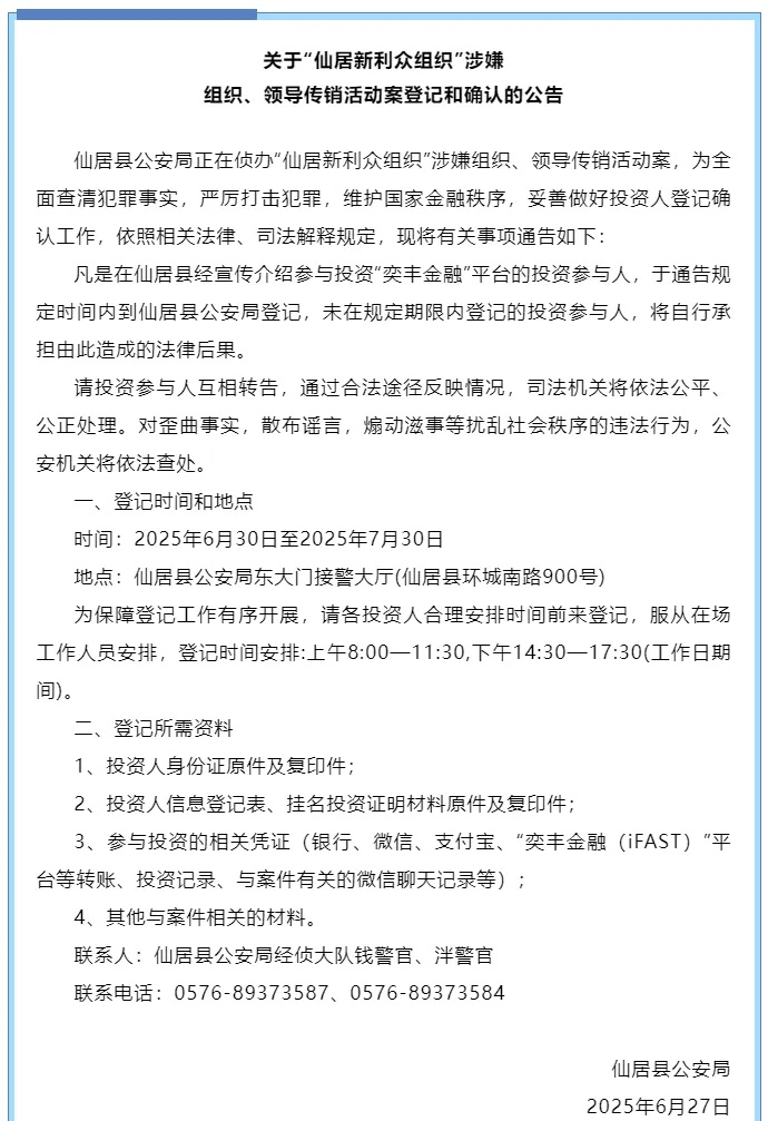 ●关于“仙居新利众组织”涉嫌组织、领导传销活动案登记和确认的公告